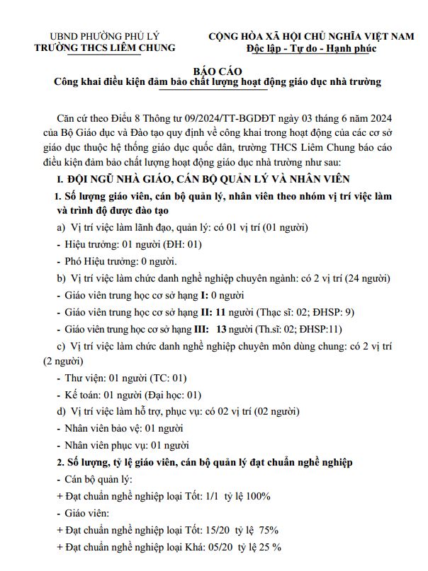 Báo cáo Công khai điều kiện đảm bảo chất lượng hoạt động giáo dục nhà trường